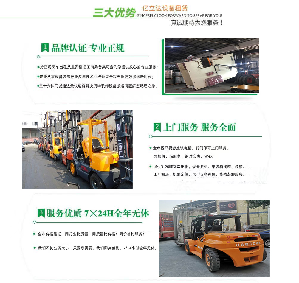 亿立达设备租赁有限公司是工商局准许的天津市职业大学专业叉车出租公司,公司本着诚信、服务、效率、创新的经营理念,用精湛的技术,真诚的服务,为众多客户提供优质的服务,同时获得信赖与支持。专业提供天津市职业大学3-20吨叉车出租、叉车租赁、设备搬运、集装箱掏箱装箱、机器移位定位、货物装卸、工厂搬迁、安全可靠,收费透明,价格便宜,随叫随到,24小时上门服务!本公司叉车吊车师傅对各种设备搬运装卸都有深刻探讨和研究。很多的疑难设备搬运,通过我公司的叉车师傅都能迎刃而解。对各种进口设备、国产机器、大型设备搬迁、高难度搬迁、各种精密仪器、医疗设备、科研设备等都能搬运; 提供全市 24 小时上门装卸搬运服务。同时提供厂房搬迁服务。 ...
